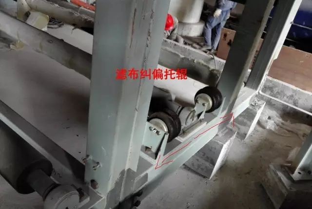6、为了*滤布的位置,设有纠偏辊筒,纠偏装置采用气囊汽缸推动纠偏辑偏转规定角度来纠正滤布的偏移。