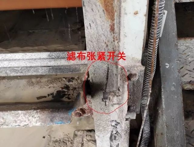 7、滤布张紧装置采用重力张紧,滤布靠重力辊筒的自重自动张紧,同时设有滤布张紧限位报警,以防滤布过度松弛而损坏滤布。
